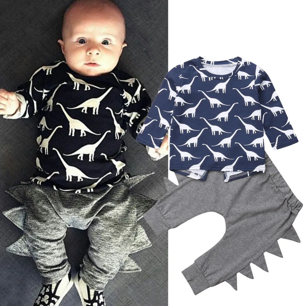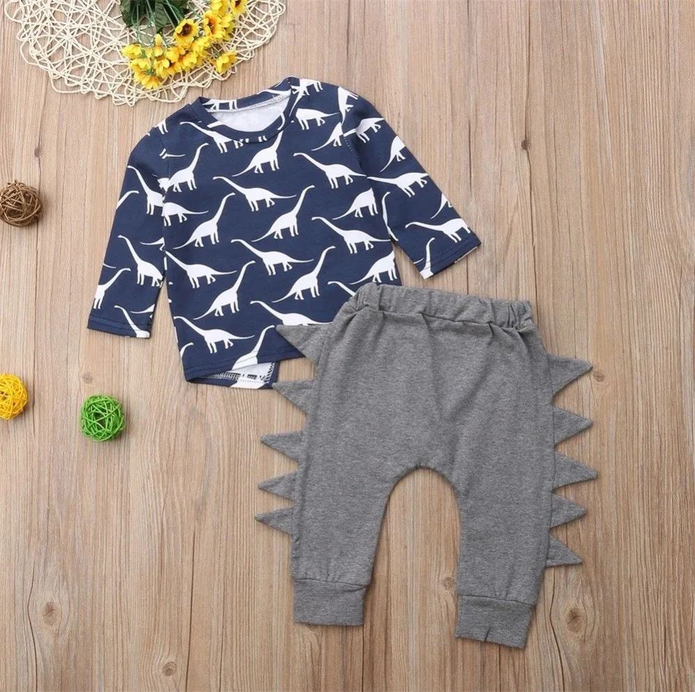 Newest Kids Baby Boys Clothes Set Dinosaur Print Tops Dark Blue T-shirt Tops+Long Pants Newborn Beb